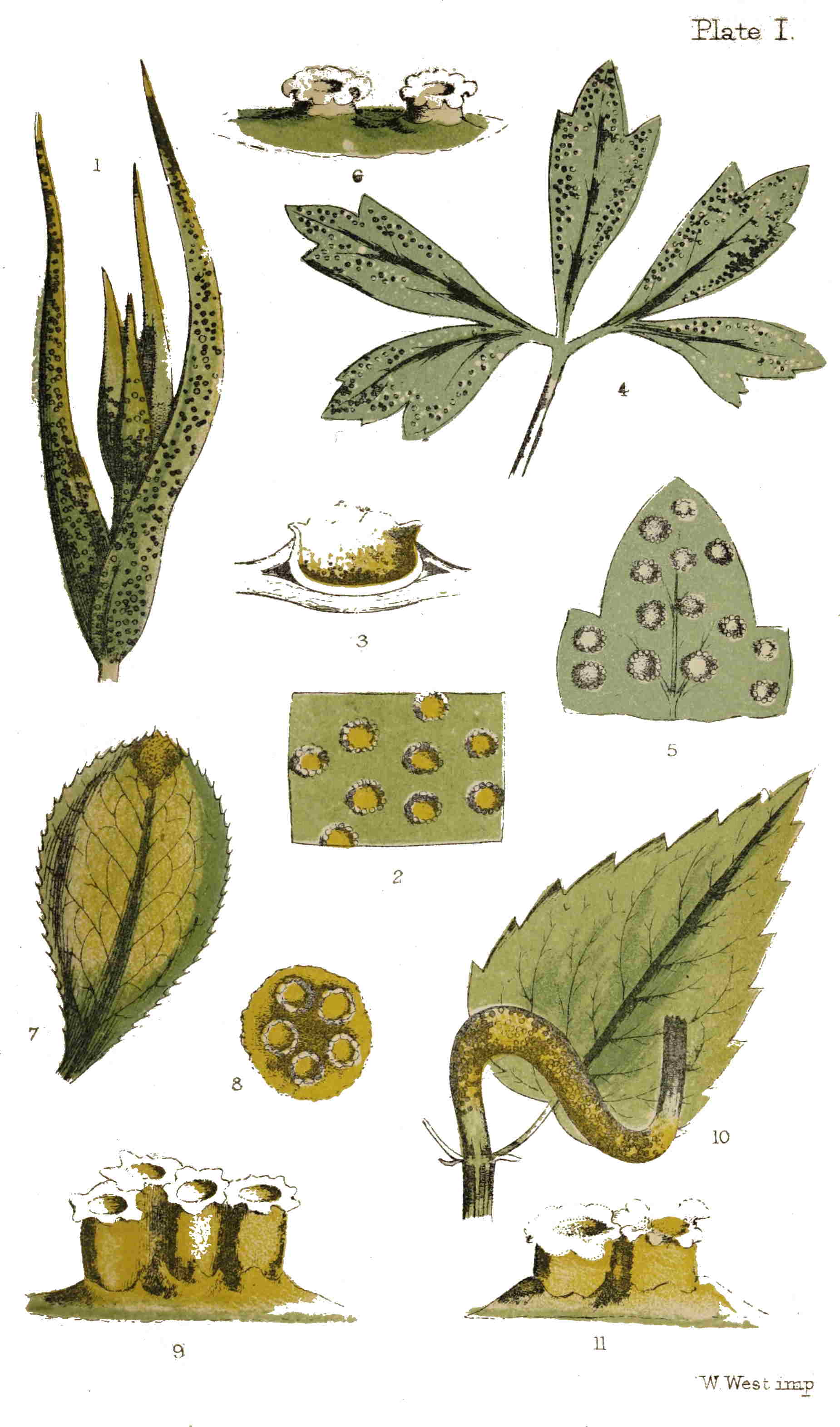 If we take a stroll away from the busy haunts of men, though only for a short distance,—say, for example (if from London), down to New Cross,—and along the slopes of the railway cutting, we shall be sure to find the plant called the goatsbeard (Tragopogon pratensis) in profusion. In May or June the leaves and unopened involucres of this plant will present a singular appearance, as if sprinkled with gold-dust, or rather, being deficient in lustre, seeming as though some fairy folk had scattered over them a shower of orange-coloured chrome or turmeric powder. Examine this singular 4phenomenon more closely, and the poetry about the pixies all vanishes; for the orange powder will be seen to have issued from the plant itself. A pocket lens, or a Coddington, reveals the secret of the mysterious dust. Hundreds of small orifices like little yellow cups, with a fringe of white teeth around their margins, will be seen thickly scattered over the under surface of the leaves. These cups (called peridia) will appear to have burst through the epidermis of the leaf and elevated themselves above its surface, with the lower portion attached to the substratum beneath. In the interior of these cup-like excrescences, or peridia, a quantity of the orange-coloured spherical dust remains, whilst much of it has been shed and dispersed over the unoccupied portions of the leaves, the stems, and probably on the leaves of the grass or other plants growing in its immediate vicinity. These little cups are fungi, the yellow dust the spores,[1] or ultimate representatives of seed, and the epiphytal plants we have here found we will accept as the type of the group or order to which we wish to direct attention (Plate I. figs. 1-3).