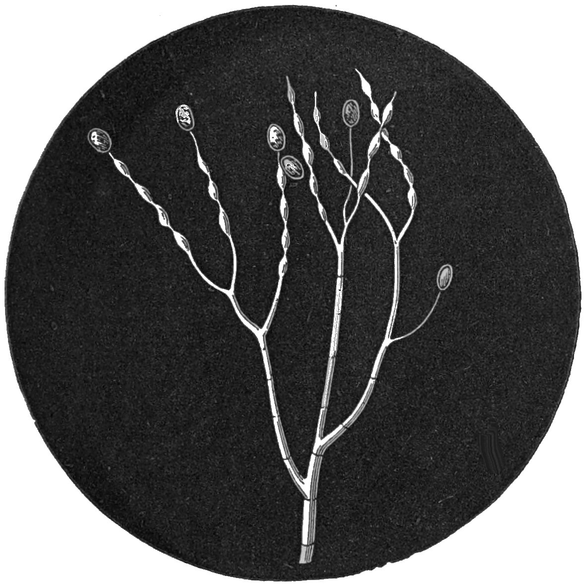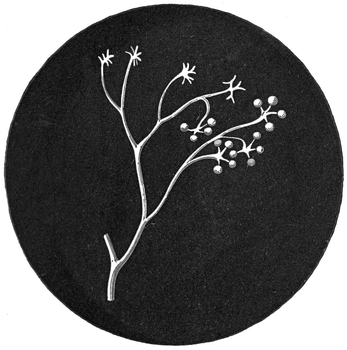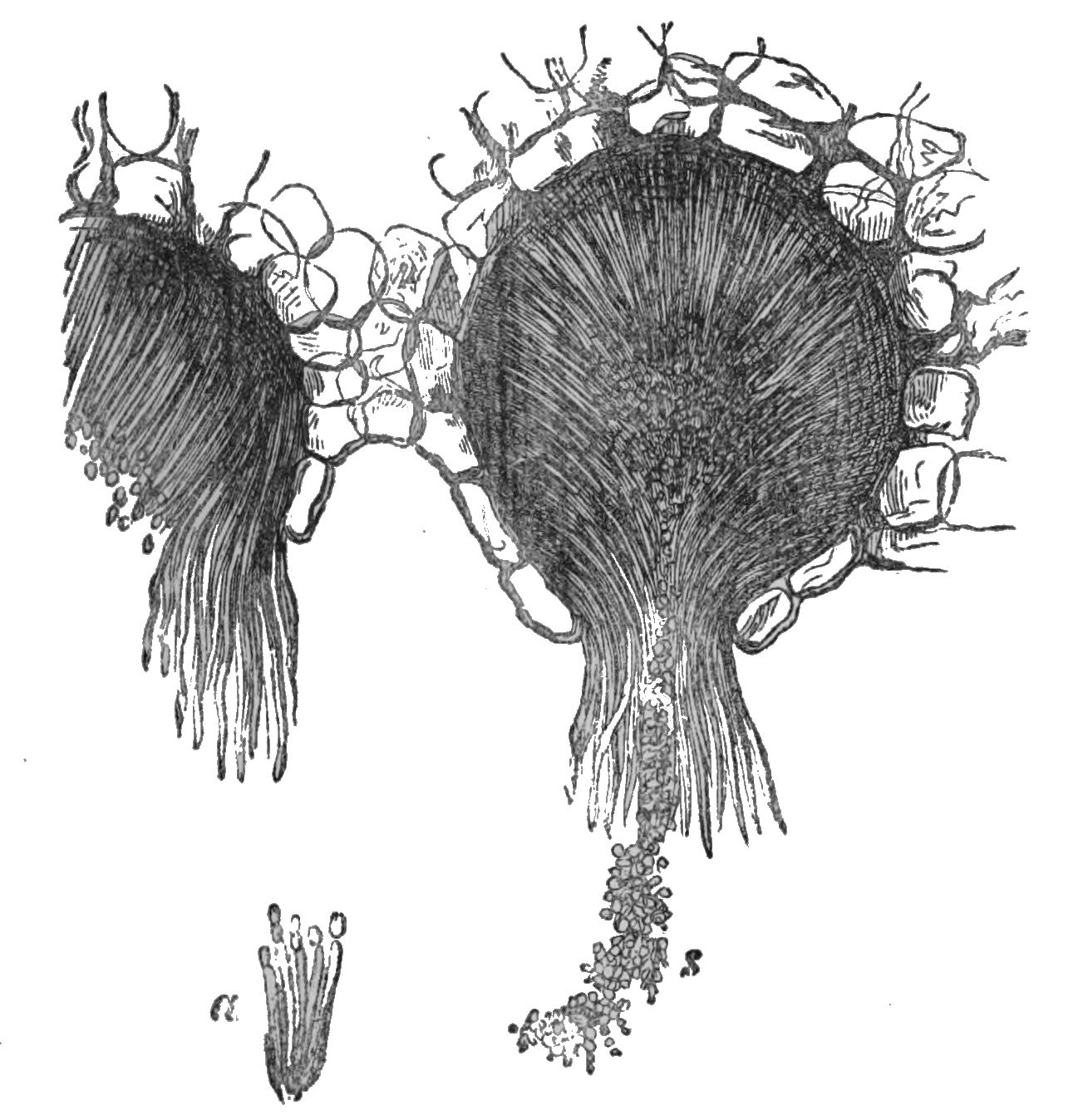 Without staying to trace the stages through which the elucidation of their true nature proceeded, it will suffice for our purpose to tell what is now known of these secondary organs; to accomplish which we must stand greatly indebted to the independent researches of Messrs. de Bary and Tulasne. It has been demonstrated that both these bodies, namely, the primary organs or cluster-cups, 23and the secondary organs or spermogones, are developed from the same mycelium; but the value of the latter is still undetermined. If they possess any fecundative power, the process has not been traced; or if they are in themselves reproductive, they have not at present been seen to germinate. Their uses, therefore, in the economy of the parasitic plant of which they are now known to form a part is still a mystery, and they remain valueless in the determination of genera and species. Any speculation which might regard them as male organs would be premature, and without support in fact. Hitherto only some species of the genera described in the foregoing chapter, and others belonging to genera not hitherto named, have been ascertained to possess spermogones. Of the former are the Rœsteliæ, some species of Æcidium, as those of Euphorbia, &c., and Peridermium Pini.