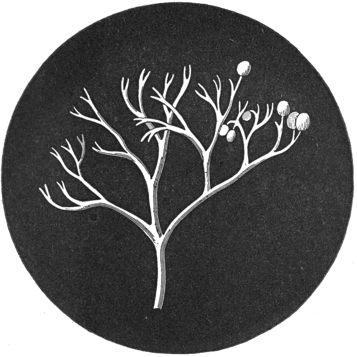 The third species occurs on the under surface of the leaves of the mountain-ash. The peridia are clustered on a rusty orange-coloured spot which is visible on the upper surface (Plate II. figs. 18, 19). They are long and cylindrical, with an evident tendency to curvature; the mouth is serrated, but not split up into threads, as in the species found on the hawthorn. There will often be found instead of well-developed peridia, what at one time were regarded as abortive peridia, forming a thickened orange or rust-coloured spot, studded with minute elevated points. These spots are clusters of spermogones, which organs are described in detail in our second chapter. The clusters and spores are of a brighter reddish-brown than in either of the other species. All are remarkably distinct, and perhaps the most curious and interesting of any that we have passed in review. To botanists, the species found on the hawthorn is known as Rœstelia lacerata, that on pear-leaves as Rœstelia cancellata, and the one on the leaves of the mountain-ash as Rœstelia cornuta.
