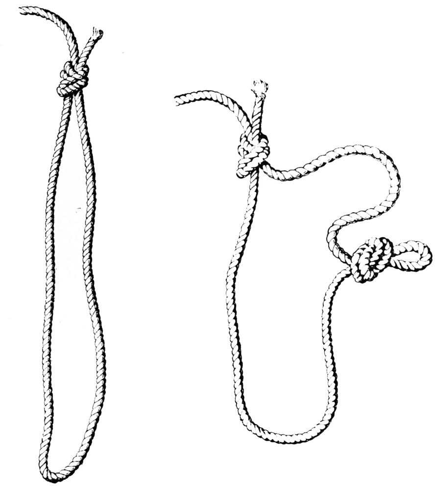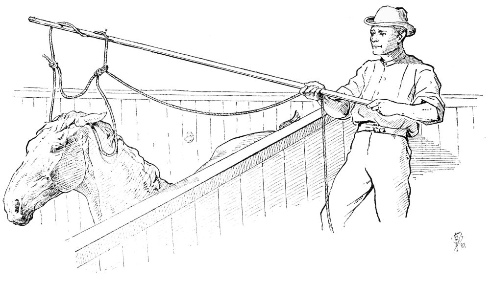 Necessity for obtaining control over the Horse.{22}—In order to fulfil the necessary conditions of safety for himself, the breaker should be able, by the system under which he works—to quote the words of that admirable horse-master, Professor Sample—to make the animal rideable and driveable before he is either ridden or driven. The breaker who employs the ordinary methods, is not alone exposed to danger when mounting, or even driving his pupils for the first few times; but also in the preliminary handling, unless, indeed, in the case of young foals. The advice to go boldly up to the horse and show him that you are not afraid of him, so freely tendered on such occasions, should be treated by its recipient as a piece of “cheap swagger,” or the outcome of pretentious ignorance; for, even granted that such a demeanour would efficiently soothe a terrified animal, or cow a treacherously-disposed one—suppositions that are altogether absurd—such counsel would in no way supply the necessary foolhardiness for such an undertaking. My{23} advice to either amateur or professional is, never to give a horse a chance of doing wrong; so, in order to be consistent after having said this, I shall endeavour to describe a method by which any horse, unsecured, say, in a yard or loose box, can be brought under complete control with, practically speaking, no risk to the operator.
