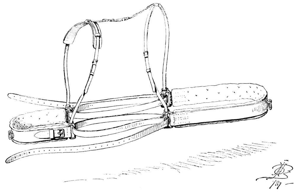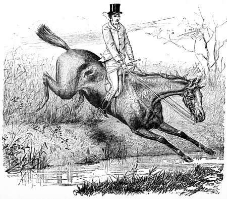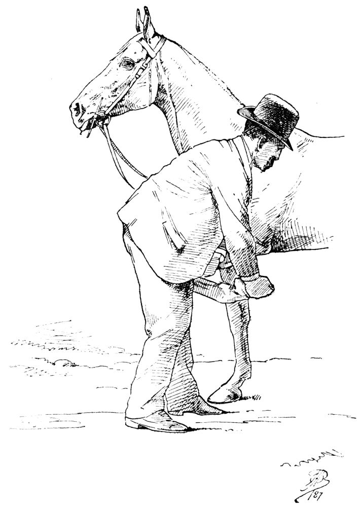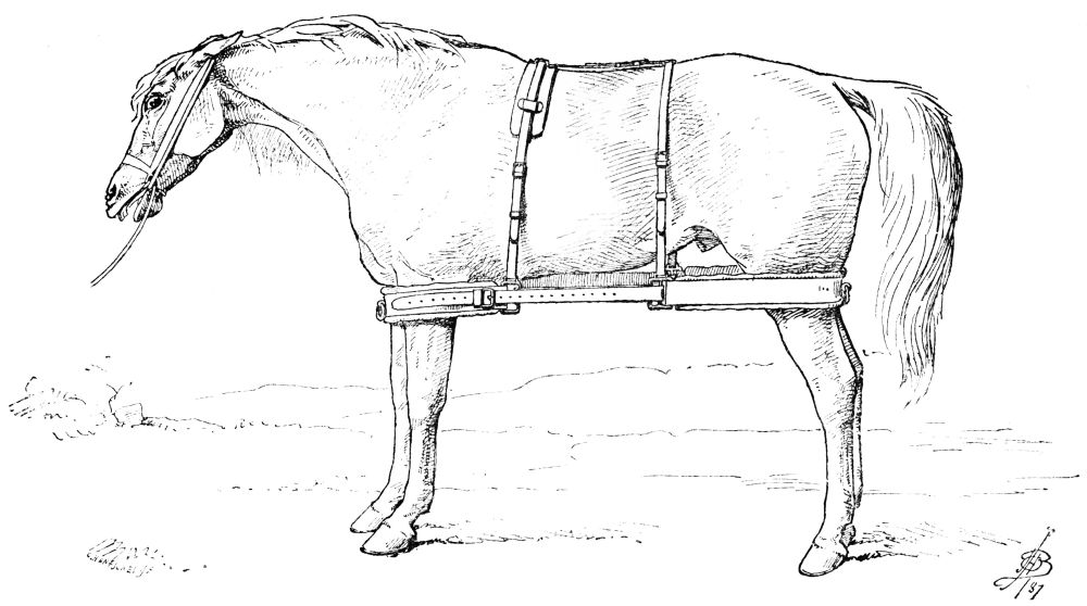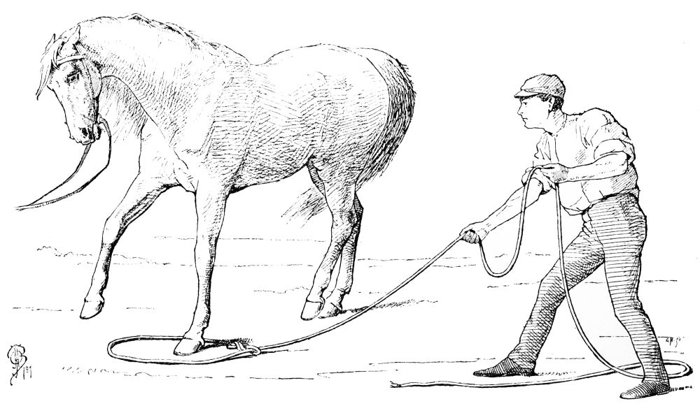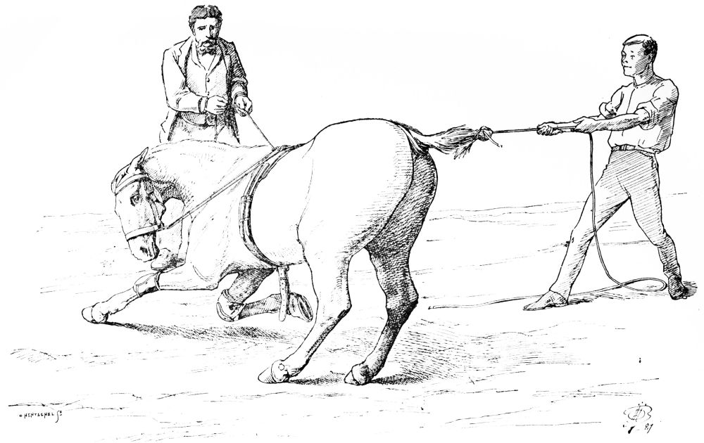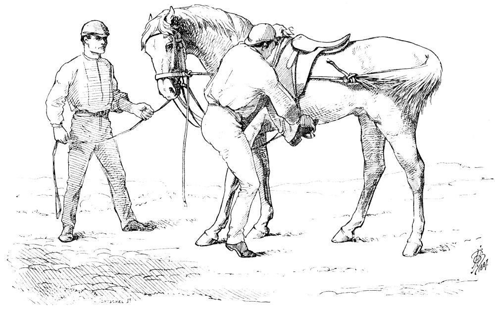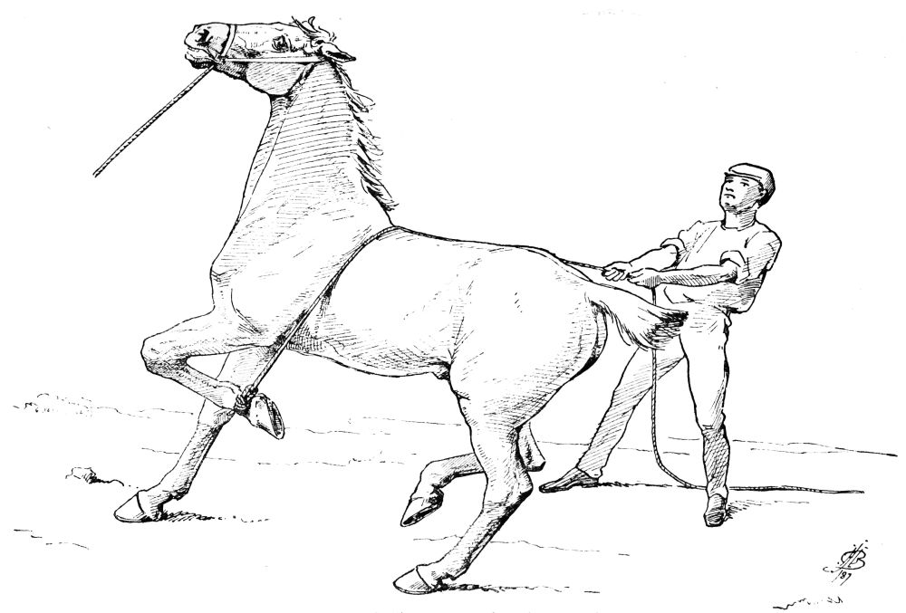 The rough and ready style of breaking.—The method of reducing a horse to discipline, by forcibly securing him, getting on his back, and sticking on until he bucks himself to a standstill, is applicable only to unbroken animals of a more or less mature age, whose owners demand nothing further, than to have them made “quiet to ride.” The objections to this method, as far as I can see, are: that it is not{38} always possible to obtain the services of a rider of sufficient pluck and adhesiveness; that some horses, by “throwing themselves over,” can get rid of any man off their back; that if the horse wins the fight, the victory will have the effect of making him much worse than he was before; that the mastery, even if the process be repeated, is, often, not permanent, especially with a new rider; that it is apt to spoil the horse’s mouth; and that, in the case of nervous or sulky animals, it is liable to increase their particular faults. The buckjumping style of breaking is, of course, only good as far as it goes, and has no just claim to teach the manners that make the horse, as assuredly as they do the man.