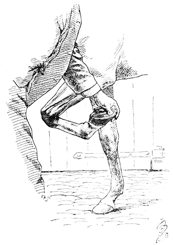 The distinction between nervousness and deliberate vice may be easily made, if we observe how a horse acts after we have proved to him that he need have no fear of us. For instance, if we fix up a horse, say, in a “strait-jacket,” (see page 118) so that he cannot kick, and continue to “gentle” him over with our hand, until he is thoroughly assured of the good faith of our intentions; we{4} might justly term him a vicious brute if he kicked at us, without our touching him, the moment the restraint was removed. I may mention, in this connection, that fear of the near approach of man will often induce a purely nervous animal to kick out, if a person, and especially a stranger, ventures to come within reach. Although we may frequently find a horse kick from nervousness, he will rarely bite from that cause alone. As a verbal distinction between faults due to deliberate vice, and those caused by fear of man, or of the animal’s strange surroundings, would not, generally, be understood at first glance, I need not attempt to make it in these pages.