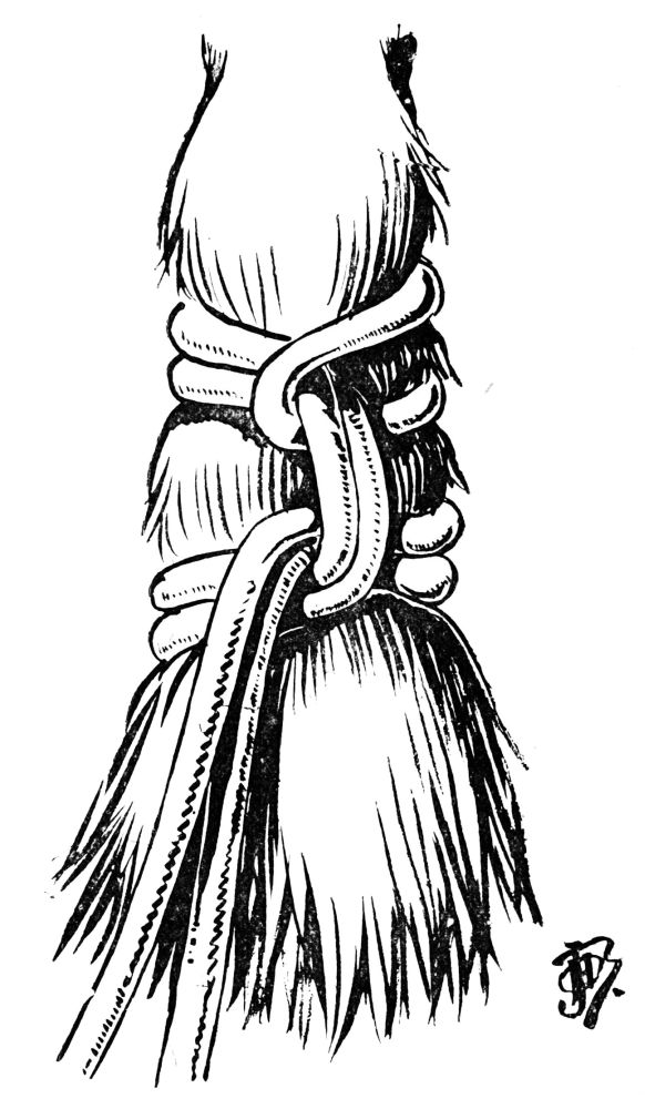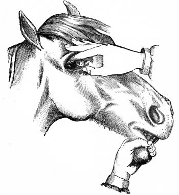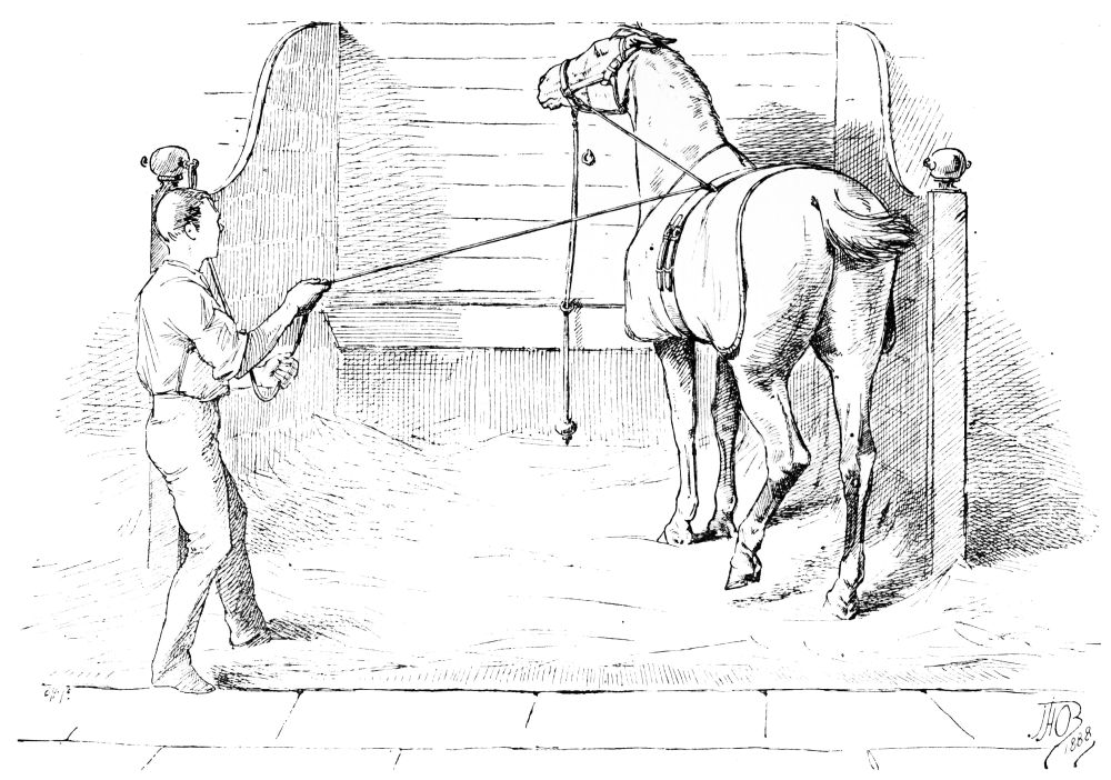 On the nature of the coercion to be applied to unruly Horses.—The only risk run in enforcing the obedience which it is absolutely necessary to exact from unruly horses, is that of spoiling the animal’s pluck and spirit—a contingency that can be incurred only when the fractiousness arises from “nervousness,” or from want of comprehension; for what we term pluck and spirit in the horse should have no taint of stubbornness. The coercion employed should, naturally, be limited to what would be sufficient to overcome the wilfulness; for we should never employ a general effect, when a particular one will answer our purpose. Thus,{24} suppose we had a high-couraged, generous animal, that had been made difficult to mount by a bad rider, on various occasions, prodding the horse in the side with his toe, when attempting to get into the saddle, we might get control over the animal by Pratt’s twitch (see page 113), or by tying him head and tail, and then prove to him that we would not touch him with our toe, when mounting. The Rareyfying of such an animal for this or any similar fault, would be injudicious in the extreme; as it would, almost to a certainty, injuriously affect one of his most valuable qualities, namely, his pluck. As a sulky animal has little or no pluck to lose; we may well content ourselves in gaining his obedience without troubling ourselves much about any possible deterioration of his courage.