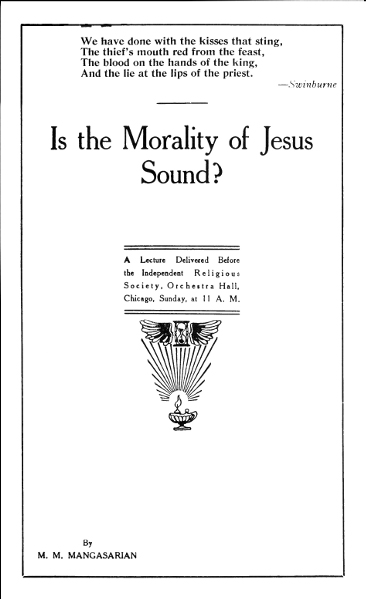 To facilitate this discussion, and to concentrate all our attention on the subject of this discourse, we will waive the question of the historicity of Jesus. For the sake of argument, we will accept the gospels as history—accept the authenticity of the documents, the trustworthiness of the witnesses, and the inspiration of the texts which we are to quote. We[Pg 4] will grant every point; concede every claim, allow every contention of the defendants. We will then say to them: Does the evidence which you have presented and we have accepted without raising any objections, prove that the moral teaching of Jesus is perfect, or even the highest the world has ever possessed?