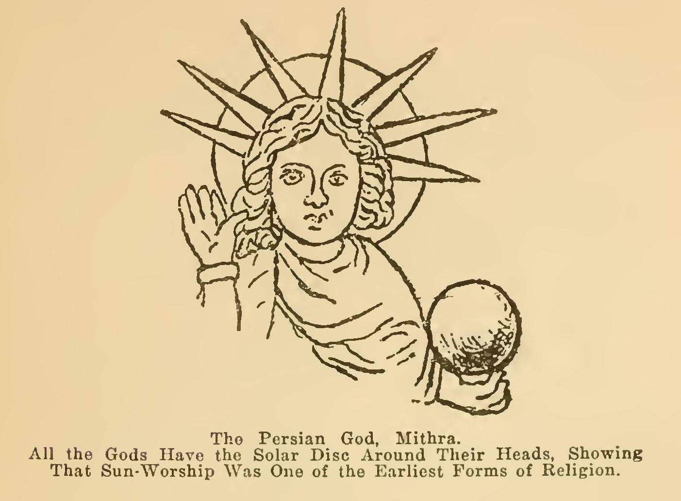 But our clerical neighbor from Oak Park has one more argument: "Why is Sunday observed instead of Saturday?" Well, why? Sun-day is the day of the Sun, whose glorious existence in the lovely heavens over our heads has never been doubted; it was the day which the Pagans dedicated to the Sun. Sunday existed before the Jesus story was known,—the anniversary of whose supposed resurrection falls in March one year, and in April another. If Jesus rose at all, he rose on a certain day, and the apostles must have known the date. Why then is there a different date every year?