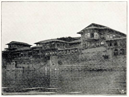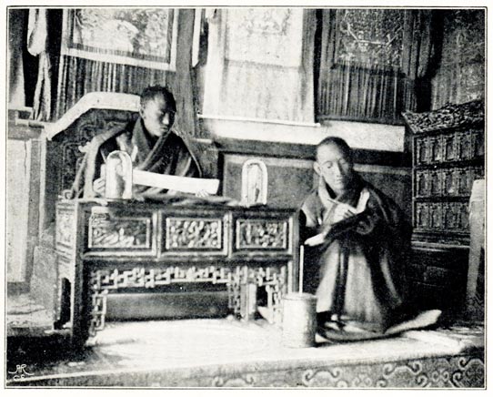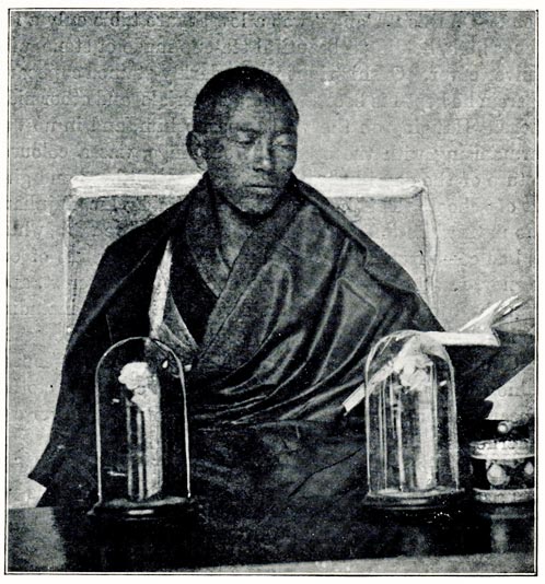 [8] Mina Fu-yeh's abbotship came to rather an abrupt termination owing to a quarrel with another influential Buddha called Shertoch Fu-yeh. At the time of the rebellion the priests were greatly exercised in their minds as to whether they should fight against the rebels or not. Most of the older men said that fighting was no part of a priest's duty, while the younger men were keen to be in the thick of it. Mina Fu-yeh, who was then abbot, said that they should not go out to fight, but that they should make every preparation, and if the monastery was attacked they should defend it to the last, otherwise they ought not to mix in worldly strife. This did not please the war party, who were headed by Shertoch Fu-yeh, and who made up their minds that fight they would. They went out on three separate occasions, and without doing any good; several were killed, a terrible thing for a devout Buddhist, for he who dies a violent death is reincarnated in an animal, and must complete a cycle of sixty lifetimes before he can again become a man. This made the war party even more bitter against Mina Fu-yeh, as they realised how much wiser the course he had recommended would have been, and so inimical did they become that he had to resign his post and for some time was in fear of his life. Most of them speak rather disparagingly of his successor, who is, they said, an insignificant Buddha, only in his third or fourth lifetime.