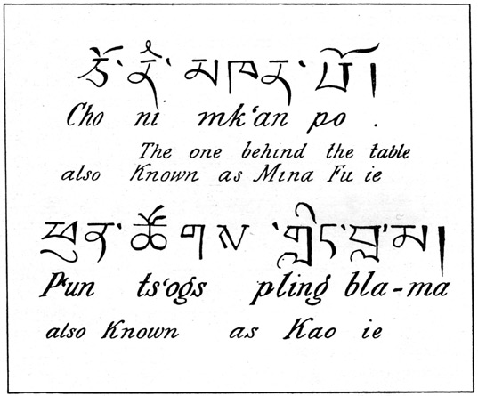 [4] There are about seventy of these "incarnate saints" at Kumbum, among whom Mina Fu-yeh ranks sixth or seventh.
