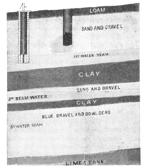 Loam, three to four feet; sand and gravel, thirty to forty feet; blue compact clay (hard-pan), twelve to eighteen feet; sand and gravel, five to ten feet; soft clay, one to five feet; and blue gravel and boulders to Devonian limestone, thirty-five to fifty feet. The first stratum of clay is very hard and tough, and for that reason is called “hard-pan.” It has an inclination from the northeast to the southwest of about thirty feet to the mile. The further north and east of White river, the less distance it is to bed rock. Occasionally below the “hard-pan” is found a small drift of soft clay, but this is not usual and does not extend very far in area; often in moving ten feet it is missed. The first seam of water is usually reached at a depth of seventeen to twenty-five feet; the second seam at fifty to sixty-five feet; and the third seam at seventy to ninety feet.