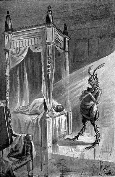 But what matter? When I felt hungry I could return at any time. Had I not the clue? Thus I said to myself as I sprinkled my last remaining crumbs behind me. I had now penetrated a very considerable distance into this abode of the pious dead, when here an unforeseen and terrible accident befell me. Walking onward and incautiously looking behind me as I proceeded, I did not observe a flight of steep steps, slippery from the damp slime that exudes below ground, and that led—where? I never knew, for suddenly losing my footing, I fell headlong down into a dark abyss, where I lay stunned and senseless.
