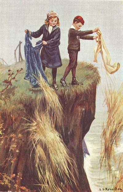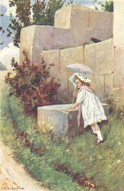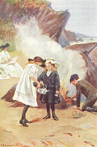 The red bucket “Thomas” grew to look quite shabby with the hard usage it had, and so many of its letters got knocked off that it was difficult at last to know what the name was meant to be. Priscilla had chosen a green bucket with “Mary” on it, as she could not get one with her first name. The colour did not go very well with her blue cloak, but she did not want to use them together very often, and when she did she solved the difficulty by carrying the bucket underneath the[155] cloak. Sometimes they went for picnics on the Downs on the top of the cliff, and one day when they were up there Priscilla saw Mr. Winter, and, running up to him, brought him over and introduced him to her mother. He seemed rather shy at first and not very happy, but the next time they met him he came up to them of his own accord and talked to them for a while, and as the days went on they even induced him to join them at their picnic teas, and when he had done so once or twice he seemed really to enjoy himself, and would ramble about with them for quite a long time, saying little, but evidently interested in all they said and did.
