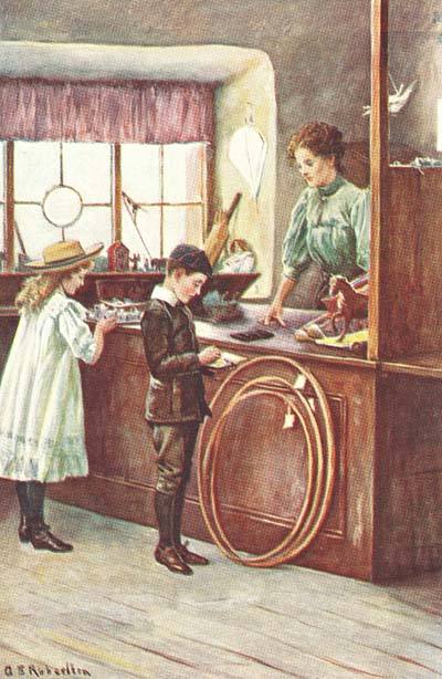 So, finding that all the excitement was over, Priscilla decided to go with Geoffrey to buy the paints, and it was while they were on their way to the shop that the sense of injustice began to grow in her small breast, and it grew and grew until, as she stood in Miss Potts’ toy-shop and gazed about her, she felt that at least two of the toys she saw there were hers by right, for she had had out two teeth, and one had hurt her very much. Geoffrey had not, of course, such deep cause of complaint, for he had accepted the sixpence gladly, and if he did not stick out for more at the time he could not very well say anything now.