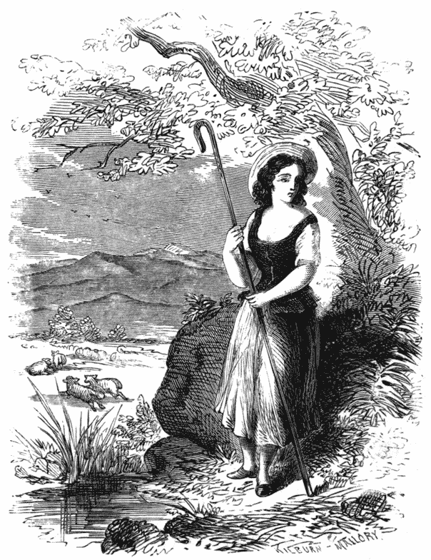 “You know my mother was English, and my father Irish. I[30] was born in the great city o’ Dublin; but after my father died, which was long enough before I could tell my right hand from my left, I went with my mother to her home in England. Of coorse, I knew nothing of that except by hearsay, which is no evidence at all; but well I can remember, when I was old enough, I was sent out on my grandfather’s farm, to mind the sheep; I had a dog, Rover, to[31] go with me, and a little crook, because I was a shepherdess, you know; and I used to carry dinner enough in my pail for Rover too, for he had to work hard, poor fellow!