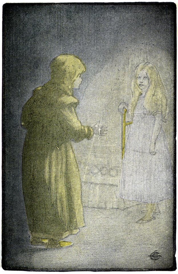 Then the king made answer: “The widow who is now her fostermother found her among the stubble under the harvest moon, and the next night she heard a tapping at her window, and went, and saw a fairy nurse standing by the sill. ‘Give me back my child,’ said the fairy nurse, ‘the child whom I laid to sleep among the stubble.’ ‘That will I not,’ quoth the widow woman, ‘for she is mine now, and I have had her christened like one of ourselves.’ ‘I love her too well to take her against her will,’ answered the fairy nurse, ‘in years to come she shall choose between us.’ ‘I love her too well to keep her against her will,’ said the widow woman, ‘so it shall be as you say.’ Thus it happens that the maid is sometimes with us, and sometimes with her fostermother.”