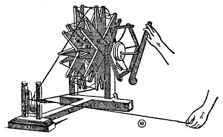 The reel noticed in the diagram between the drum and the handle is composed of a wooden disc marked 9 made out of 1 inch thick and 6 inches square piece of wood. Six brackets made of galvanized wire of 10 gauge radiate from the centre of the disc so as to make a circumference of 4 feet. The brackets are fixed in the back of the disc with bent ends and are further secured with small nails near the circumference of the disc.