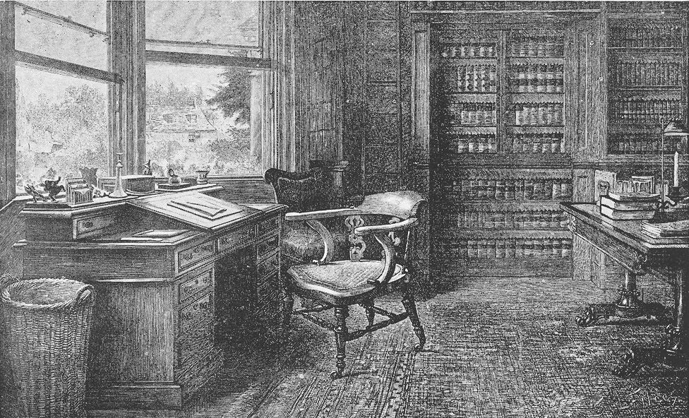 p. 50At “Gad’s Hill” he first made a study from one of the large spare sleeping rooms of the house, as the windows there overlooked a beautiful and favorite view of his. His writing table was always placed near a window looking out into the open world which he loved so keenly. Afterwards he occupied for years a smaller room overlooking the back garden and a pretty meadow, but this he eventually turned into a miniature billiard room, and then established himself, finally, in the room on the right side of the entrance hall facing the front garden. It is this room which Mr. Luke Fildes, the great artist and our own esteemed friend, made famous in his picture “The Empty Chair,” which he sketched for “The Graphic” after my father’s death. The writing table, the ornaments, the huge waste paper basket, which “the master” had made for his own use, are all there, and, alas, the empty chair!