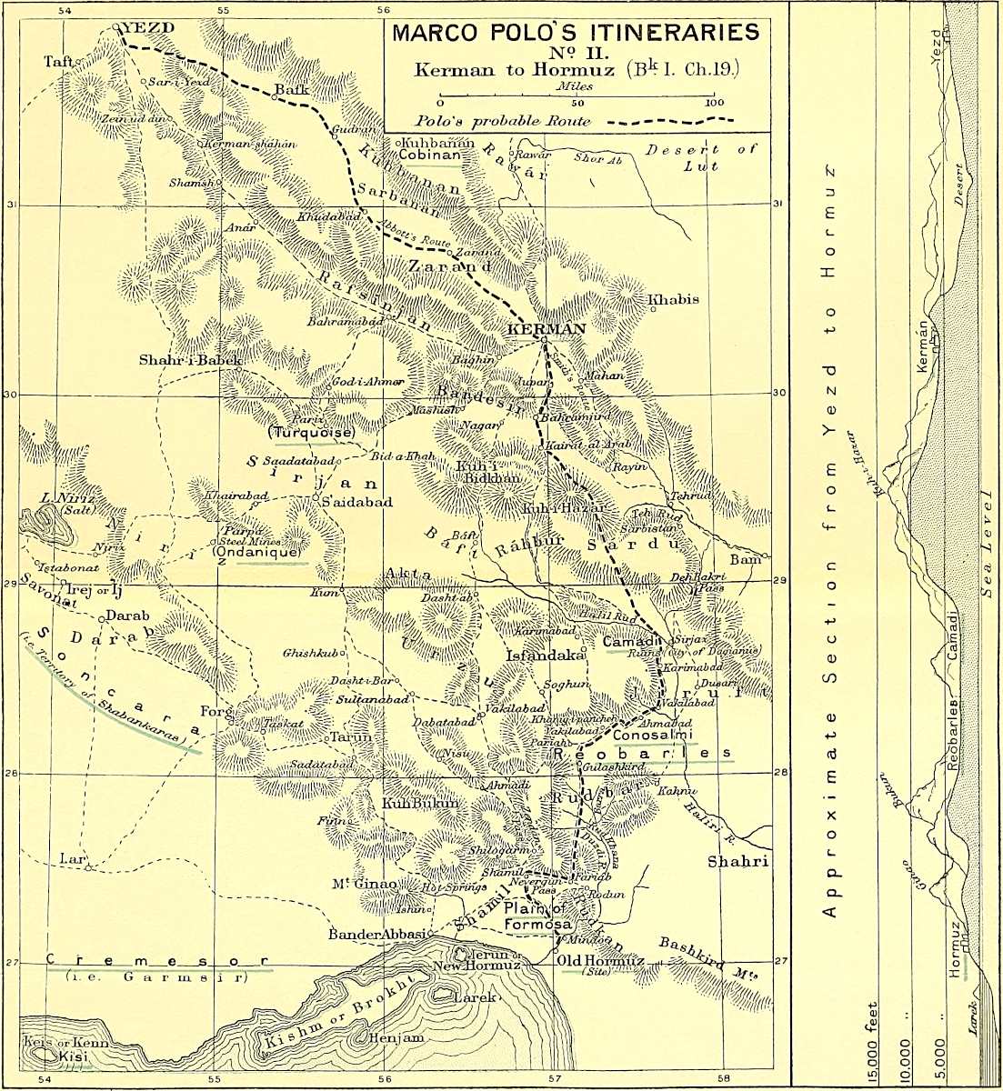 The Baron F. von Richthofen, now President of the Geographical Society of Berlin, a traveller who not only has trodden many hundreds of miles in the footsteps of our Marco, but has perhaps travelled over more of the Interior of China than Marco ever did, and who carried to that survey high scientific accomplishments xiiof which the Venetian had not even a rudimentary conception, has spontaneously opened his bountiful stores of new knowledge in my behalf. Mr. Ney Elias, who in 1872 traversed and mapped a line of upwards of 2000 miles through the almost unknown tracts of Western Mongolia, from the Gate in the Great Wall at Kalghan to the Russian frontier in the Altai, has done likewise.[1] To the Rev. G. Moule, of the Church Mission at Hang-chau, I owe a mass of interesting matter regarding that once great and splendid city, the Kinsay of our Traveller, which has enabled me, I trust, to effect great improvement both in the Notes and in the Map, which illustrate that subject. And to the Rev. Carstairs Douglas, LL.D., of the English Presbyterian Mission at Amoy, I am scarcely less indebted. The learned Professor Bruun, of Odessa, whom I never have seen, and have little likelihood of ever seeing in this world, has aided me with zeal and cordiality like that of old friendship. To Mr. Arthur Burnell, Ph.D., of the Madras Civil Service, I am grateful for many valuable notes bearing on these and other geographical studies, and particularly for his generous communication of the drawing and photograph of the ancient Cross at St. Thomas’s Mount, long before any publication of that subject was made xiiion his own account. My brother officer, Major Oliver St. John, R.E., has favoured me with a variety of interesting remarks regarding the Persian chapters, and has assisted me with new data, very materially correcting the Itinerary Map in Kerman.