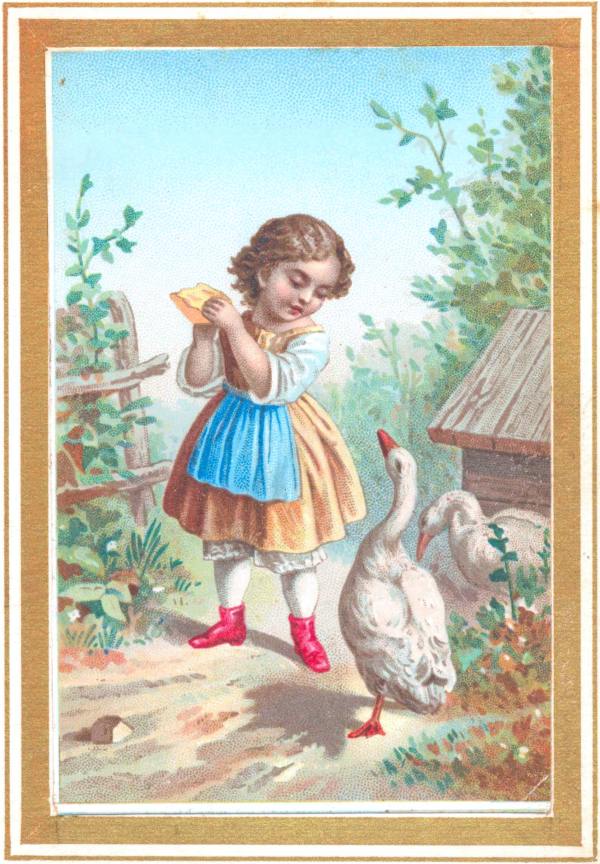 Bright and early next morning, Mabel was dressed and out of doors, with a piece of corn-bread in her hand to feed the chickens and geese. She felt the least bit of terror when the geese craned their long necks and hissed at her, but they soon stopped this and became very friendly.
