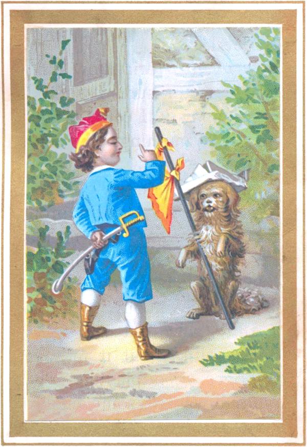 Folks talk about dumb creatures, but they are not very dumb, are they, children? though they have not the gift of speech. They soon learn to know who love them, and they testify their affection in many pleasant ways. Now Luce was not a dog to strike up friendships with everybody, but he and Johnnie seemed to like each other at first sight. Of course, [pg 27] the very first evening, bedtime came early, and weary eyes were very glad to shut. But before noon the next day Johnnie had discovered that his new companion could perform ever so many tricks: he could shoulder arms, stand on his hind feet, pretend to smoke a pipe, carry a basket, and beg in the most enchanting manner. Johnnie played soldier with Luce for flag-bearer, for nearly an hour, till his auntie called him in.