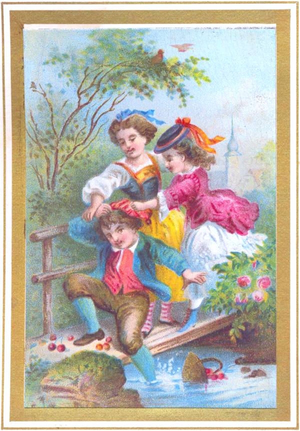 Two or three days after that, the children were in a part of the garden, in which was a bridge over a darling little brook, as Edith called it. They were expecting their parents by the first steamer, and Johnnie had been gathering a basket of the ripest and reddest cherries he could find, to have them all ready for offering to mamma on her arrival. As he was running lightly over the bridge, his foot slipped, and he [pg 56] came near falling in, but Edith and Mabel flew to the rescue, and held him up by his cap, and his curls, and his arm, till he recovered his balance. One foot was very wet. It had gone "way, way in," and in that condition, splashed and barefoot, for he pulled off the wet boot and stocking, he went back to the house with the girls.