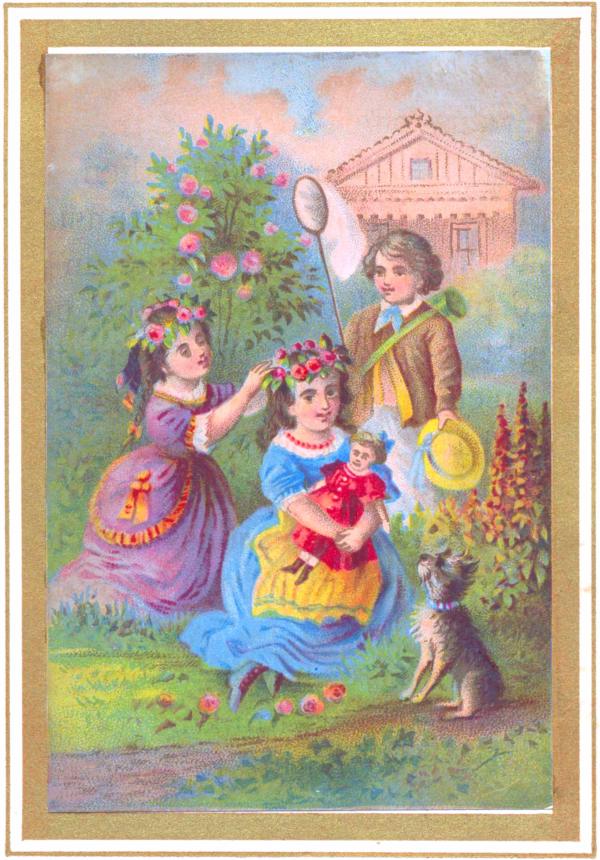 For all that Miss Josephine had been left at home, the little girls had [pg 32] not been obliged to live without a doll. Kind Aunt Maria had given them each one soon after their arrival. Out in the garden, then, with the dollies, Luce full of enthusiasm, and barking and rolling like an animated puff-ball, or else sitting up as straight as a judge, they were playing queen. Mabel had just fastened the wreath on Edith's head, when Johnnie very gravely observed,