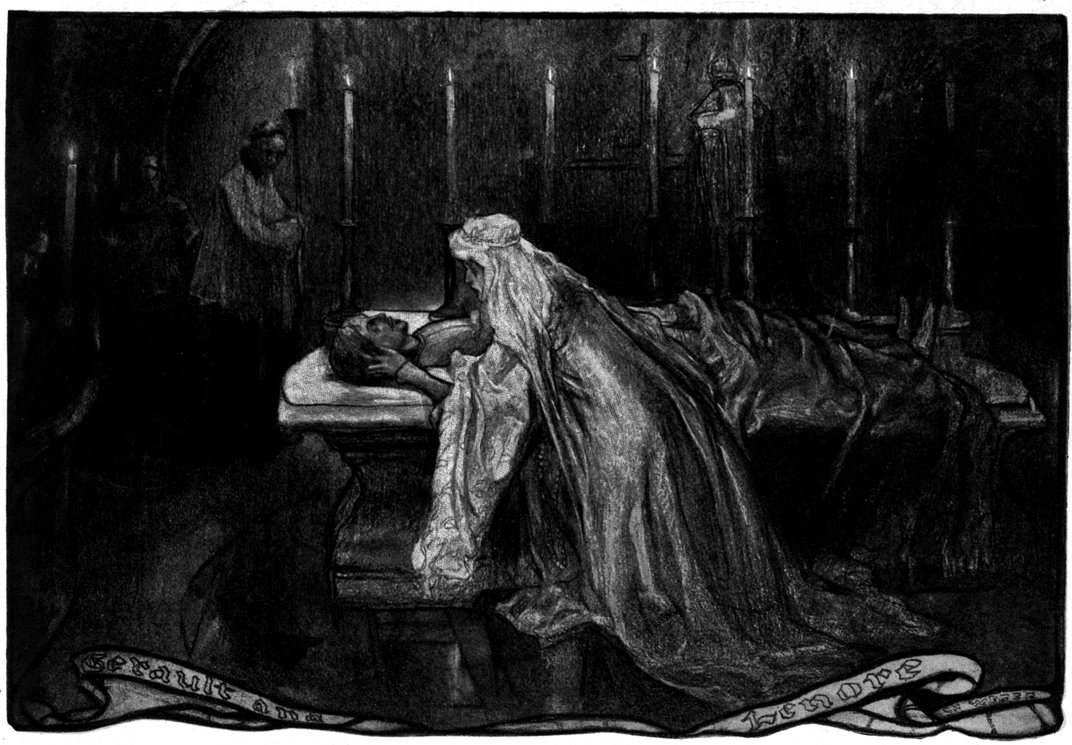 It was mid-April: a sunny afternoon. A flood of golden light, borne on gusts of sweet, chilly air, poured through the open windows of the Castle into a high-vaulted, massively furnished bedroom, hung with tapestries, and strewn with dry rushes. A heavy silence that was less a thing of the moment than a part of the general atmosphere hovered about the room; and it was not lessened by the unceasing murmur of ocean waves breaking upon the face of the cliff on which the Castle stood. This sound held in it a note of unutterable melancholy. Indeed, despite the sunlight, the sparkle of the waves, and the fragrance of the fresh spring air, this whole building, the culminating point of a long slope of landscape, 2seemed wrapped in an atmosphere of loneliness, of sadness, of lifelessness, that found full expression in the attitude of the black-robed woman who knelt alone in the high-vaulted bedroom.