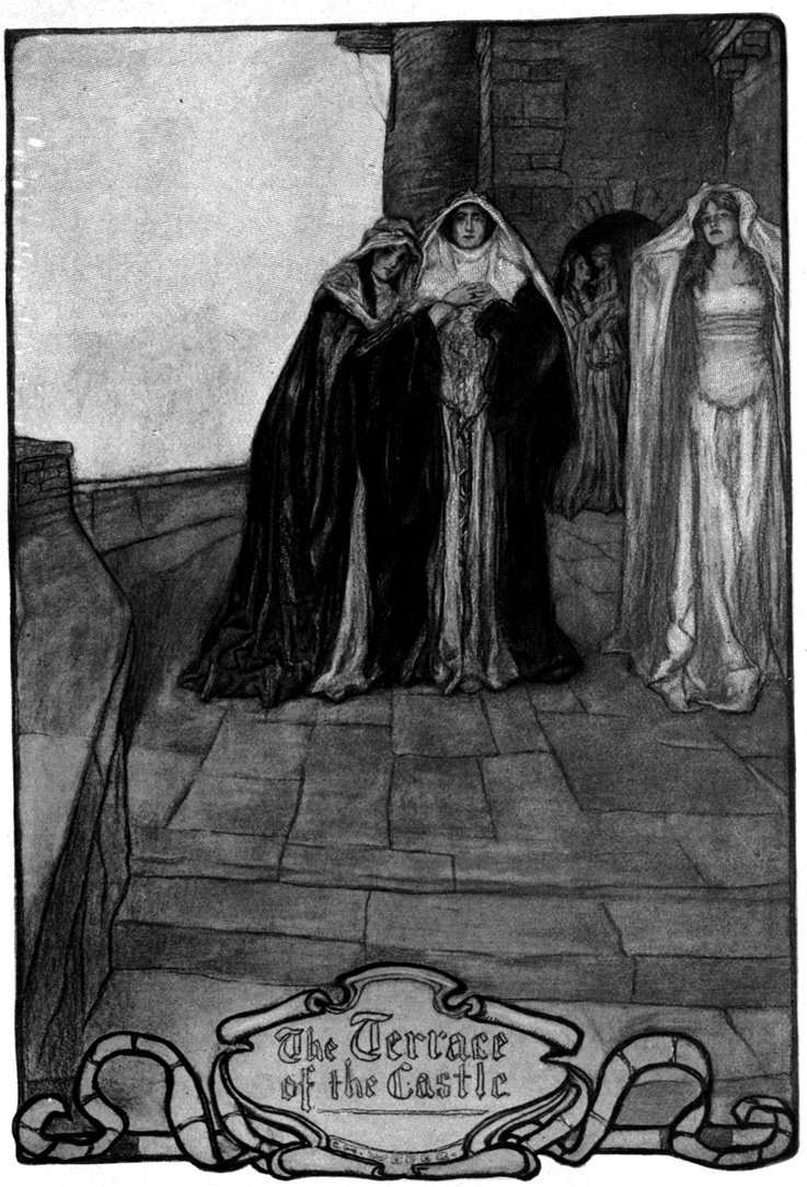 The sweet dusk deepened, but it was not yet time for the rising of the moon. There was still a flush of red in the west, and still the breasts of the gulls that veered over the waters flashed white and luminous in the gathering gray. The silence was absolute, save for the silken swish of the tide rising gently along the shore. The spell of twilight, the great soul-twilight of the middle ages, hung heavy on the battlements of the Castle on the cliff. On the terrace the three women paused in their 429slow walk. Lenore, her white face uplifted, and a look in her face as if the gates of Heaven had opened a little before her eyes, said dreamily,—