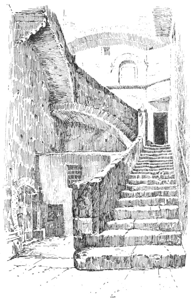 [54] We would point out that, as far as prisons are concerned, the nineteenth century has certainly improved in cleanliness and decency upon its predecessors. We visited the dungeons in the Via della Gabbia, one bitter winter afternoon, and left them shuddering. The following day we were taken through the wards of the unromantic modern building which stands—a veritable eyesore to the artist—on the southern slope of the city. Civilisation has brought great good in certain things, if not more beauty for humanity. The modern prisons of Perugia are given over to the care of Belgian nuns. There seemed to be a scent of freshest lavender in the long cool rooms where the prisoners sleep and work, and we left them we may almost say with comfort, or, at least, with far happier feelings than those which had saddened us the night before in the gruesome cells of the Palazzo Pubblico.