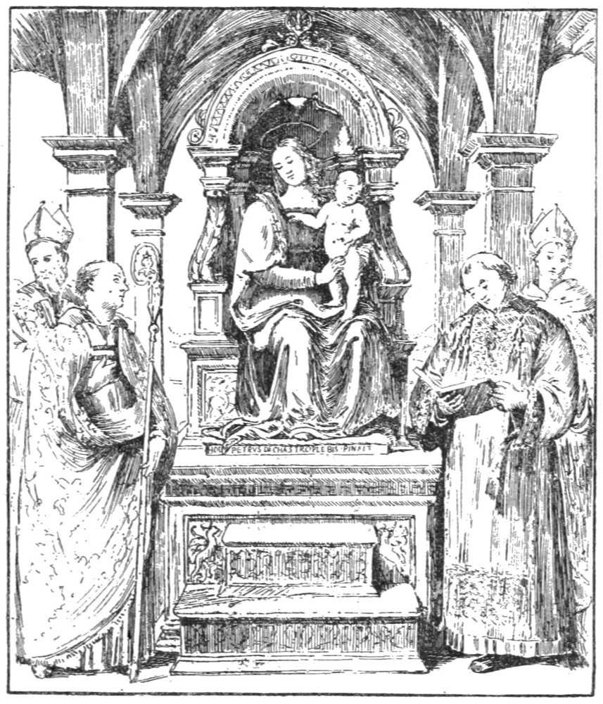 [51] It is difficult to reconstruct these earlier buildings, which have almost entirely vanished with time and different fires, but they lay more to the west of the piazza, and formed a fine group, with a great flight of steps leading up to them from the square. The church of the Maestà delle Volte belonged to them; also the exquisite little arch which is left standing alone at the head of the Via del Verzaro. For an accurate idea of the first plan of the buildings in the piazza it would be well to look at a picture in the Pinacoteca, which hangs in the small room out of the Sala di Mariotto.
