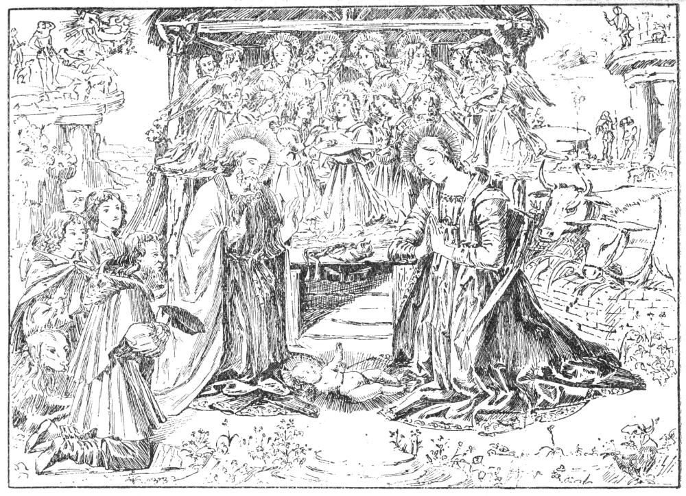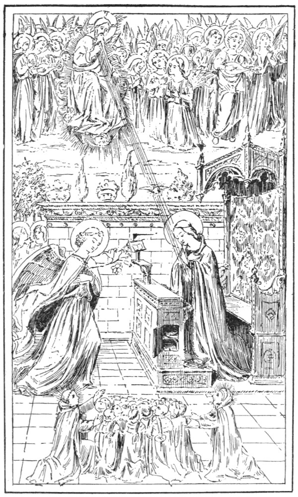 [97] The picture is a curious record of the times. Two excommunicated women kneel in the right hand corner; one of them is huddled in a veil, but the other, fair and soulless as Greek Helen, turns aside and smiles.