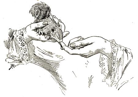 That was naughty, and he knew it; and his lady slapped him a little, and said, “No, no, Mitchell!” very crossly, and he jumped away, his tail all fluffy, and ran as fast as he could and tucked[197] his head up her sleeve as far as he could get it.