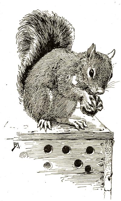 You see, he did not crack his own nuts, because he did not know how. It must be that mother squirrels start the nuts for their young ones; but[202] Little Mitchell’s lady did not know that, only she saw nuts that the squirrels had gnawed, and there were two little holes in the sides opposite each other. But Little Mitchell did not gnaw the sides of the nut,—he always tried to gnaw the end; and you know it would take him forever to get at the meat that way. So finally the lady started his nuts with a penknife in the right place, and Little Mitchell would try very hard to finish opening them; but he liked much better to have his nuts cracked with a hammer, so that he could peel off pieces of the shell.