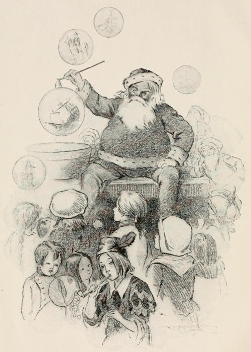 All paused a moment to reflect on this fine sentiment, when a log at the back of the pile that had hitherto held itself aloof, rolled up in a ragged cloak of charred bark, now turned over with a snort, falling on the others heavily. “The forest, indeed! Landlubbers all! I have been to sea! I have been shipwrecked! I have stood on my head and turned somersaults in mid-ocean!” And he stuck out his tongue, sending forth darts of the most wonderful green and blue. Thoroughly roused now, the logs all talk at the same time, bragging of their adventures and of the family trees from which they have sprung, and there’s no knowing how it would end if it were not that some people passing sing a snatch of an old Christmas Carol, a great favourite with the hearth-logs, so that they cease wrangling to listen to it.