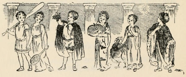 Costumes, etc.: Time, an emblematic figure; Months dressed according to characters: January wears a mask at back of head, resembling face; February is the shortest child, and walks with a skipping leap at every fourth step; March’s costume suggests the lion and the lamb, etc. Scenery may be elaborate, or simple, or dispensed with entirely. A sun-dial or a clump of rocks may be placed at back of stage, where Time will take his position while the Months recite. Snow may be simulated by small pieces of white paper being gently dropped from above, or by a little salt being placed in the folds of a character’s coat, so that it drops off lightly, or by a frosty little dab of[10] soap-suds on the shoulder melting almost immediately. Taking a commanding position Time will summon each Month in turn by name, through a megaphone, then when the Month appears will retire to the back of stage till the recitation shall have been concluded. The Months will appear when summoned, in turn, disappearing on the opposite side of stage, if possible behind a piece of scenery, reappearing at back of stage, there to remain quietly till the ensemble at close. Appropriate music for exits and entrances may be used. The songs and dances may be arranged to popular tunes. Colored lights if skilfully handled may be used.