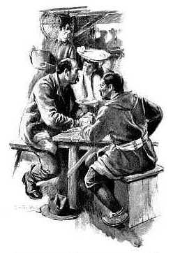 "You liar!" kicking over the barrel that served for a table, with a volley of oaths Mops sprang at him, and a free fight would have ensued but for the intervention of the more cautious, who, pointing to a squalid bundle from which lusty snores were issuing, reminded the belligerents that if Bully Nick were roused from his innocent slumbers some indiscriminate gun-play might be looked for, transmuting every mother's son into cold meat. This argument prevailed; peace was restored and celebrated in the dire wassail of the district, served in the open by Ikey, bartender of the dilapidated[13] refreshment-tent nearby, and by general consent charged to the protesting but helpless Sandy.