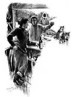 While glasses were being refilled, this time at Mops' expense, Maclane went toward the tent, over whose entrance hung the sign KLONDIKE DELMONICO'S. GUMBOOT ANNIE. Addressing the plump female in jersey and culottes, who lolled beneath, picking her teeth skilfully: "Good day, madam," he began, baring his head. "I should like to speak with the proprietor."[14]