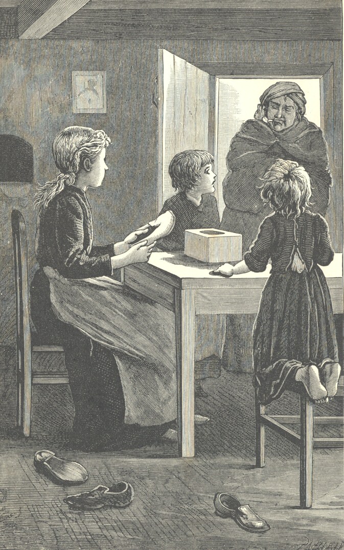 Mary was at this time about twelve years old. One evening she was sitting at the foot of her mother’s bed spinning, and her little brothers and sisters were gathered round the fire eating their potatoes and milk for supper. “Bless them, the poor young creatures!” said the widow, who, as she lay on her bed, which she knew must be her deathbed, was thinking of what would become of her children after she was gone. Mary stopped her wheel, for she was afraid that the noise of it had wakened her mother, and would hinder her from going to sleep again.