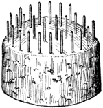 A fruit pricker is easily made and saves time (fig. 3). Cut a piece half an inch deep from a broad cork; press through this a dozen or more coarse darning needles; tack the cork on a piece of board. Strike the[11] fruit on the bed of needles, and you have a dozen holes at once. When the work is finished, remove the cork from the board, wash and dry thoroughly. A little oil on the needles will prevent rusting. With needles of the size suggested there is little danger of the points breaking, but it is worth remembering that the use of pricking machines was abandoned in curing prunes on a commercial scale in California because the steel needles broke and remained in the fruit.