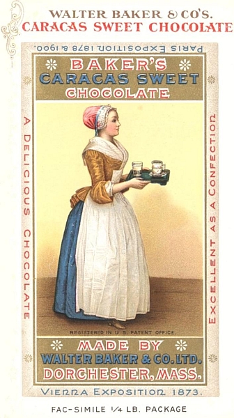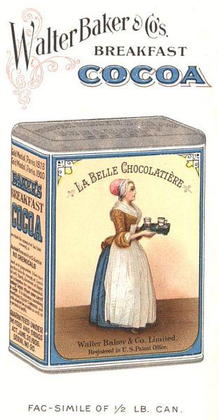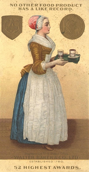 It is the pure product of carefully selected cocoa beans, to which nothing has been added and from which nothing has been taken away. Unequalled for smoothness, delicacy and natural flavor. Celebrated for more than a century as a nutritious, delicious and flesh-forming beverage. The high reputation and constantly increasing sales of this article have led to imitations on a very extensive scale. To distinguish their product from these imitations Walter Baker & Co., Ltd., have enclosed their cakes and pound packages in a new envelope or case of stiff paper, different from any other package. The color of the case is the same shade of deep blue heretofore used on the Baker packages, and no change has been made in the color (yellow) and design of the label. On the outside of the case, the name of the manufacturer is prominently printed in white letters. On the back of every package a colored lithograph of the trade-mark, "La Belle Chocolatière" sometimes called the Chocolate Girl, is printed. Vigorous proceedings will be taken against anyone imitating the package.