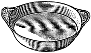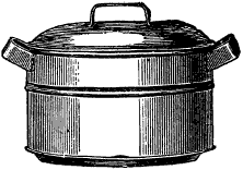 Mixing-bowls come in yellow and white ware. The white is stone china, and is more durable than the yellow; and although it costs more than the latter, it is cheaper in the end. A steamer of medium size is one of the most useful utensils. If it be light and simple, it will be used frequently for making puddings and for warming over food, etc. The cheapest kind is made of tin, and in two parts, the lower part being a deep saucepan, into which the water is put, and the upper part a round pan with a perforated bottom. Be particular to see that the cover and all other parts fit well.