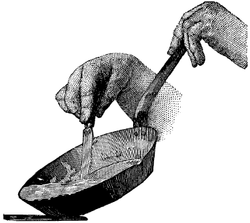 Table cutlery, as the designation was formerly understood, included all the knives and forks, nut-picks, etc. To-day, among well-to-do people, all the forks, except that which belongs to the carving set, are either sterling-silver or silver-plated. It is astonishing how the table appliances have multiplied in this luxurious age. For the fish course there are sterling-silver knives and forks of special shapes, and a broad silver knife and fork for serving the fish. Oyster forks of another shape are considered indispensable when raw oysters are served. Knives and forks of medium 10size are used for entrées, the forks being silver and the knives having silver, silver-plated, or steel blades. For the meat course the forks are silver and the blades of the knives steel. The dessert knives and forks are silver-plated; the butter knives that are placed by the little bread-and-butter plates are silver. So it will be seen that the cutlery of to-day does not mean for fine tables what it did formerly. Common knives and forks are made with flat tangs, to which pieces of wood or bone are joined for the handle. In fine knives the tang is made round, and is pressed into a round groove made in the handle. Sometimes this is fastened with a rivet, sometimes with a spring, and again with some cement.