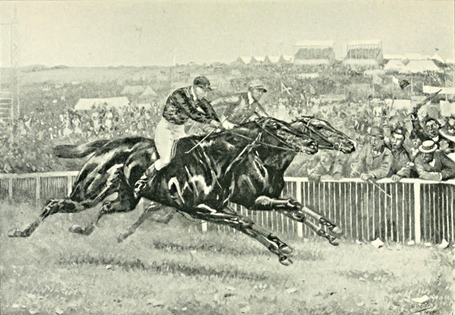 The King’s most memorable triumph was his first Derby in 1896, when Persimmon won. This fine horse is a bay by St. Simon, and own brother to Florizel II., who was, by the way, the first really good horse that ever carried the Royal colours, and is the sire of several very promising animals. Persimmon was never beaten by any horse except his own half-brother, St. Frusquin, who twice defeated him, and Omladina, who finished in front of him in the Middle Park Plate. He was bred by the King and trained by Marsh at Newmarket. He made his first appearance in the Coventry Stakes at Ascot as a two-year-old, and, starting favourite, won the race. On the occasion of his next appearance, in the Richmond Stakes at Goodwood, he was again favourite, and again won by a length. In the Middle Park Plate, though favourite, he was beaten by St. Frusquin, but in the Derby of 1896 he beat his half-brother by a neck. At the Newmarket First July Meeting he gave 3 lb. to St. Frusquin, and was beaten in the Princess of Wales’s Stakes. He won the St. Leger by a length and a half; and in the Jockey Club Stakes at Newmarket on the 1st October he won by two lengths from Sir Visto, the Derby winner of 1897.