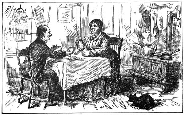 “Yes,” says he, “and good dinners and breakfess’es, too. I will say this for you, Samantha, there haint a better cook in Jonesville, than you be, nor a woman that makes a pleasanter home.” And he went on placidly, as he stood there with his back to the fire a warmin’ him, a lookin’ serenely round that bright warm room, and ont’ that supper table.
