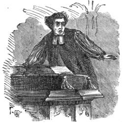 “Well! Betsey Slimpsey!” says I, beginnin’ agin, and wavin’ my right hand in a eloquent wave, “There hain’t no more beautiful sight on earth than to see two hunan soles, out of pure love to each other, gently approachin’ each other, as if they must. And at last all thier hopes and thoughts, and affections runnin’ in together, so you can’t seperate ’em nohow, jest like two drops of rain water, in a mornin’ glory blow. And to see ’em nestlin’ there, not carin’ for nobody outside the blow, contented and bound up in each other, till the sun evaporates ’em, (as it were) and draws ’em up together into the heaven, not seperatin’ of ’em up there—why such a marriage as that is a sight that does men and angels good to look at. But when a woman sells herself, swaps her purity, her self respect, her truth, and her sole, for barter of any kind, such as a house and lot, a few thousand dollars, the name of bein’ married, a horse and buggy, some jewellry, and etcetery, and not only sells herself, but worse than the Turk wimmen goes round herself, huntin’ up a buyer, crazy, wild eyed, afraid she won’t find none—when she does find one, suppose she does have a minister for salesman, my contempt for that female is unmitigable.”
