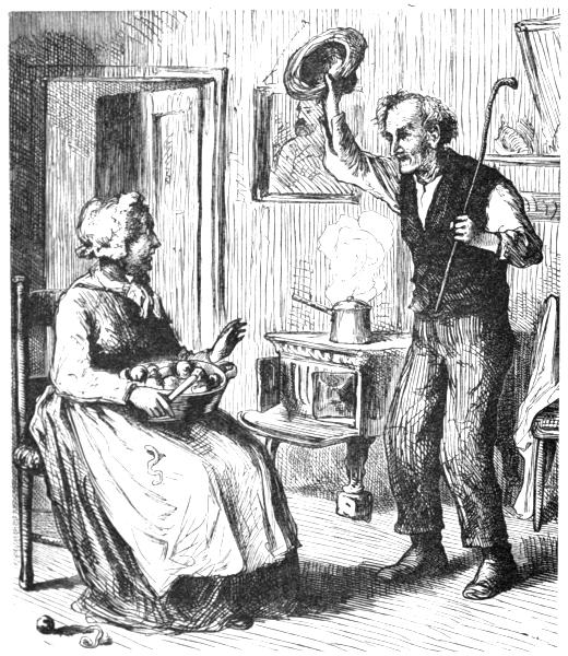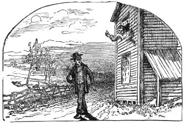I had got the table all set, and had jest opened the door to see if he was a comin’, when lo! and behold! there he stood on the doorstep—he had come and put his horses out before I see him. He looked awful depressted, and before he got the snow half off’en his boots, says he: