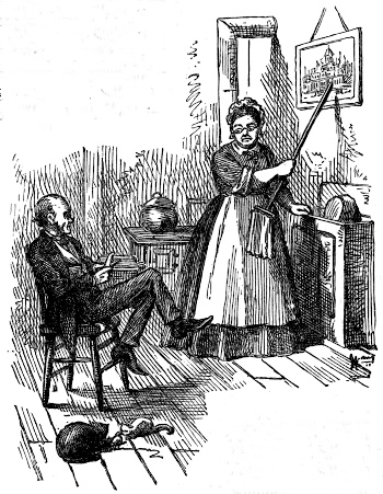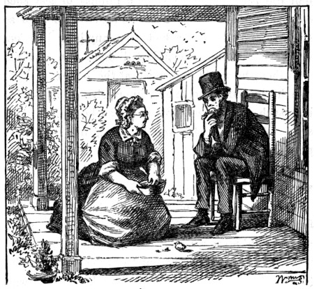 “Wall,” says he, sweetly (for his mean sense I told him what we was goin’ to have for supper had looked perfectly beautiful), “you set down and rest, Samantha, and I will pick ’em for you.”