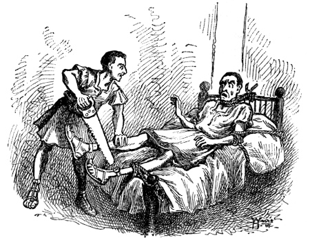 “Wall,” says I reasonably, “So I think. But everybody has their little different ways and excentricities, and it don’t look well for us to meddle with ’em. Now that feller by the name of Procrustes, at Attica village. Now, I always thought he went too far. He had a iron bedstead, and he used to make everybody that traveled his way lay down on it, and if their legs was too short, he would stretch ’em out to fit that bedstead, and if they was too long, he would saw ’em off.”