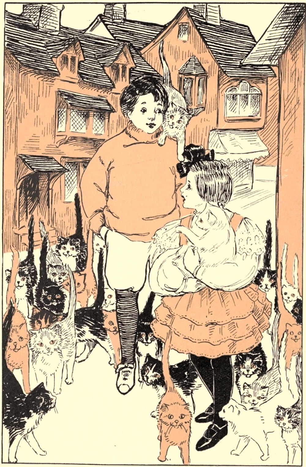Looking back, the children and their cats saw gathered on the walls of the city all the Purrers, just as they had seen them when they arrived. Again they were singing, and though as Rob and Lois walked down the road they could no longer understand the words of the song, Ban-Ban and Kiku-san understood them, and they were these, sung to the air of “My Lady Lou:”
