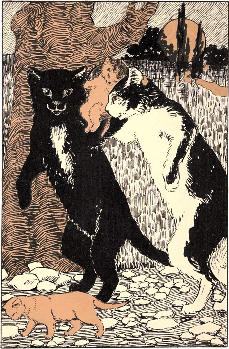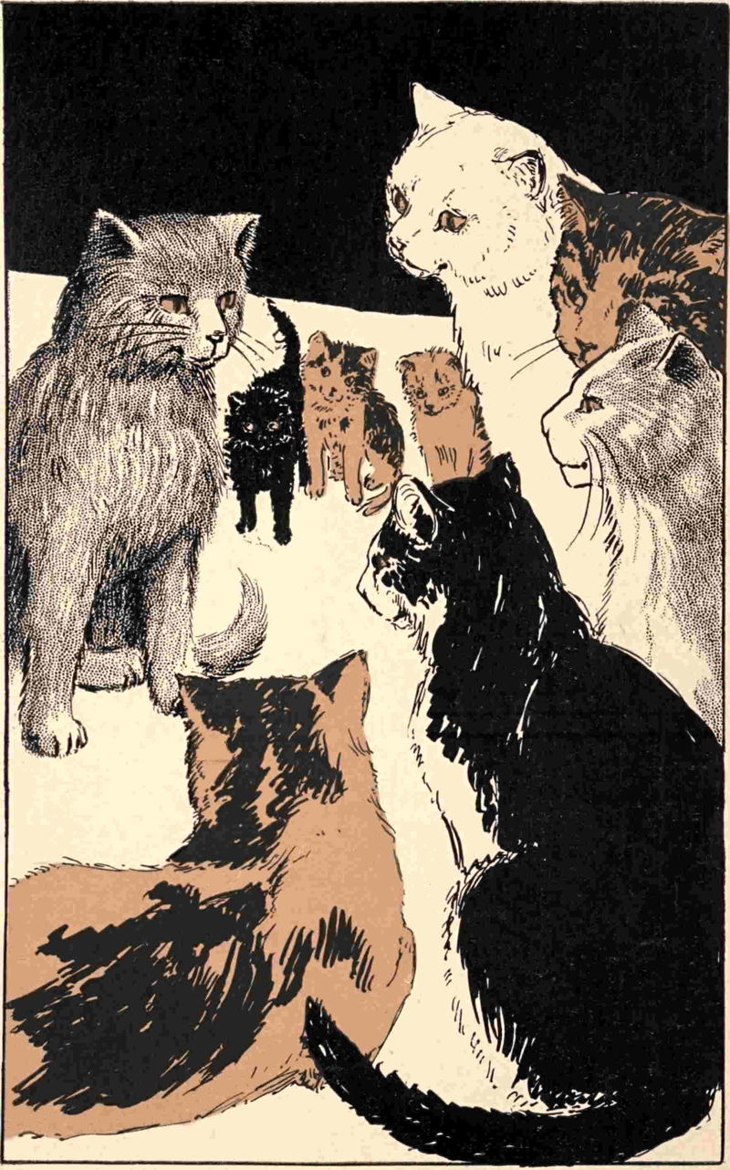 “Human beings,” Ban-Ban continued, trying to keep back the little puffing spits which he often gave when he was stirred, “Human beings build towns and live in them. They never ask our help; they feel that they own the towns. Very likely they do; but as their cats always own the human beings, it doesn’t matter. What I have to suggest is that there is no reason why cats should not build and own a city just as the human beings do. I think that we should be the ones to do this. Let us, all of us here, go away to some lovely spot and build a city. Let us ask all the poor, homeless cats, who don’t own any human beings, and so have very little food and no warm places to live, to join us. Let us have a city of cats, and let us hand our names down in all future categories and catalogues and histories as the Fathers—and Mothers”—he added, bowing to Madam Laura and Bidelia—“of Our Country, Glory of Our Race.”