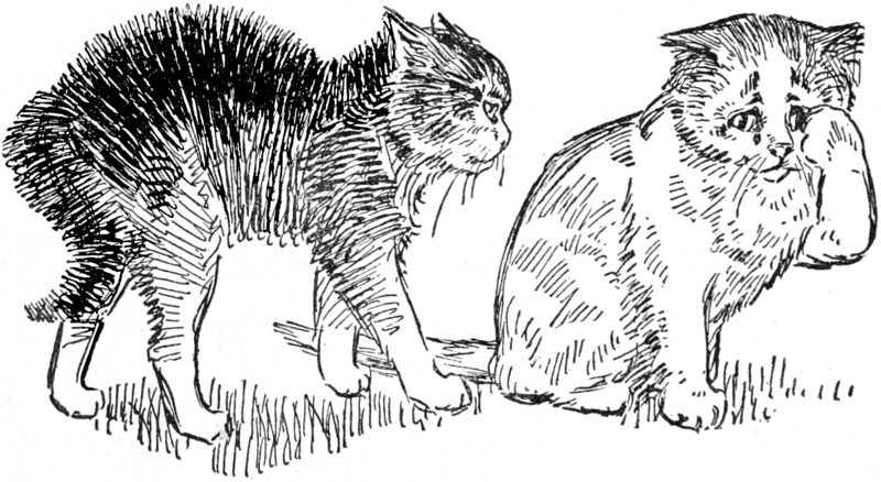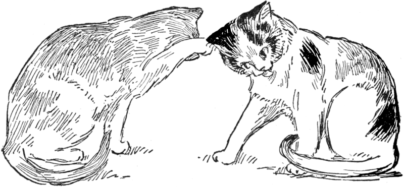 “Gentlemen, your servant,” said the Maltese cat, bowing to the Purrers with an impressive air, and expressing himself in a manner which at once betrayed the fact that he had lived with a family where English classics were read aloud. “My name is Ods Bobs, gentlemen; it is a name as old as the reign of Queen Elizabeth. This lady is called Lady Blanche. We lived in the same house in town; one of us had been brought up by one old maiden sister, the other by the other. Lady Blanche and I were looking forward to being married and living happily ever after, looking forward to spending our lives together to their end, just as we had spent them together thus far from kittenhood, when—imagine our horror!—I learned that the person who had brought me up intended sending me away to her brother’s little girl, while Lady Blanche stayed on with her protector! It was not possible to submit to such a fate! We made up our minds to run away; of course to run away together. And where were we so likely to run as to Purrington, of which we had heard such glowing accounts from other cats? So we came; here we are! Will you receive us among you?”