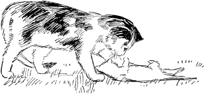 Bathing in the Meuse proved to be a pleasant experience, and breakfast was delicious eaten under the trees. As soon as it was cleared away, all the cats seated themselves in a circle and waited, washing their paws and faces once in awhile, but very lightly, much as human beings use finger-bowls after meals, and only to occupy the time.